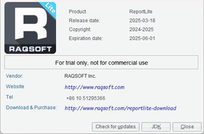 Click Help -> About to view information of the ReportLite product, as the following screenshot shows: