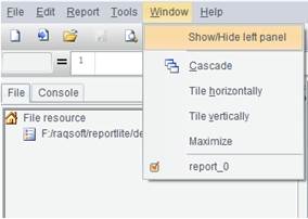 By default, the left panel on the designer is hidden after ReportLite is installed. You need to drag it wider to make it display. Click “Show/Hide left panel” and the left panel will be expanded or collapsed, as the following screenshot shows: