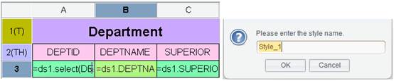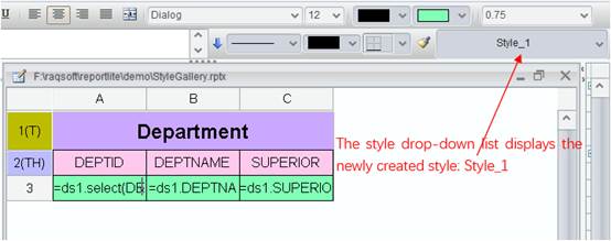 If the other cells also use the same style, you can just use it without re-defining one for them. Click a selected cell and choose an existing style name in the style gallery. You can also find the desired style in the Preset cells & style panel and drag it up to the target cell. The style information is saved in “Report layout config file” on Tools -> Options -> File tab.