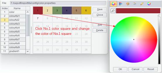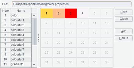 The color scheme is saved in the color scheme file color.properties (default path is【default reportlite designer installation path】\ reportlite\config\color.properties).