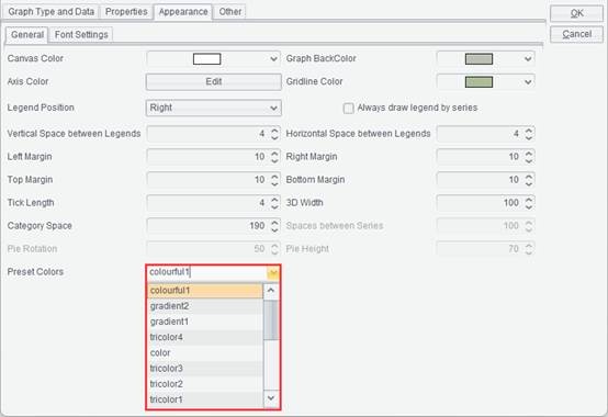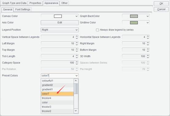 You can use an edited color scheme to plot a graph. Click Report -> Graph on the menu bar to get into the “Graph Properties” interface, and switch to “Appearance” tab, where you select a color scheme in “Preset Colors” drop-down list, as the following screenshot shows: