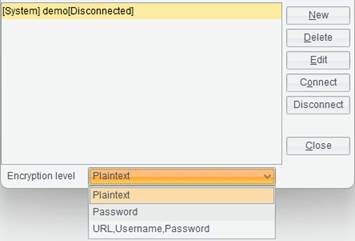 Encryption level: Encrypt URL, username or password in the data source definition. The value corresponds to encryptLevel property configured in raqsoftConfig.xml file. The encryptLevel property value is 0 (plaintext), 1 (password encryption) or 2 (URL, username and password encryption).
