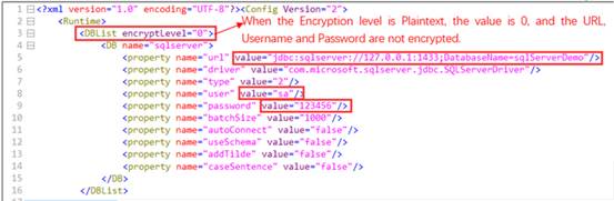 With plaintext encryption level, encryptLevel = 0 will be automatically set up in the data source configuration in raqsoftConfig.xml file. In this case, URL, username and password won’t be encrypted, as the following screenshot shows: