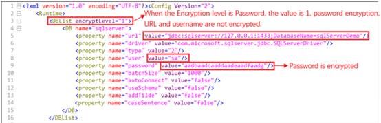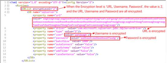 URL, Username, Password — Encrypt URL, username and password in the data source definition. In this case, encryptLevel = 2.