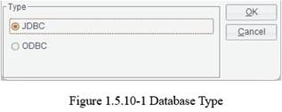Click “New” button to get into the following “Select a type” dialog box. There are two types of databases – JDBC and ODBC, as the following figure 1.5.10-1 shows: