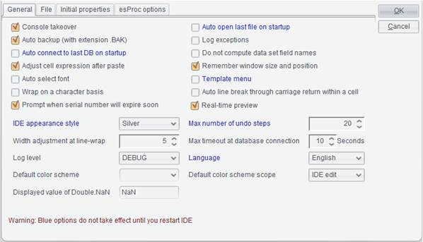 Switch to “esProc options” tab in options configuration interface, where you can define esProc configurations, as the following screenshot shows: