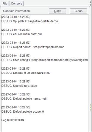Decide whether to write report execution log to the console or not through this option. When it isn’t checked, the “Console” panel won’t appear on the left of the designer. When it is checked, we can view the system log on the “Console” panel.