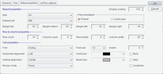 Switch to “Initial properties” tab in options configuration window, where you can define default values for a newly-created report’s report properties, row/column properties and cell properties, as the following screenshot shows: