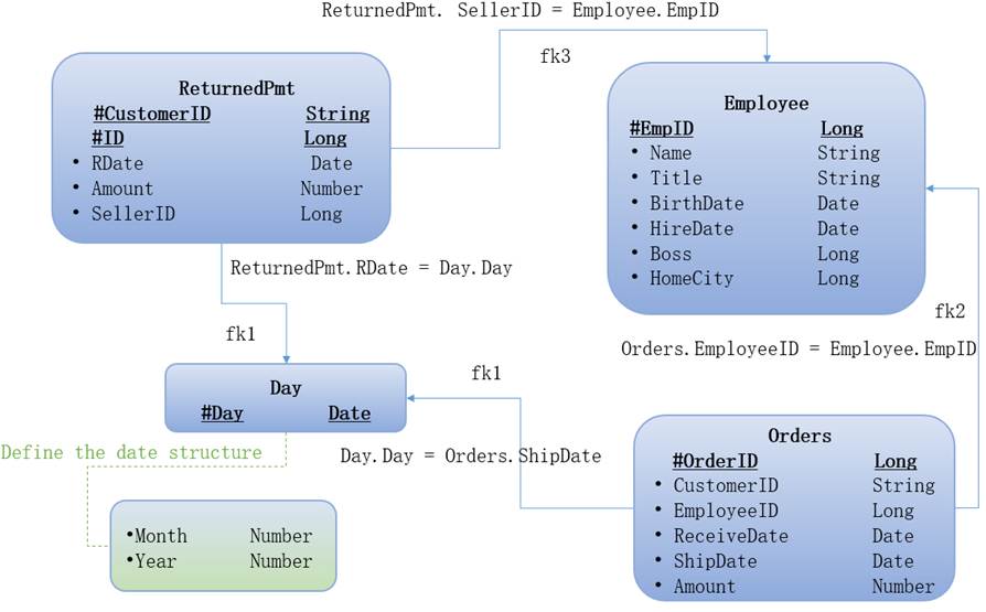 SELECT ReturnedPmt.sum(Amount) Pamount,Orders.sum(Amount) Oamount ON year,EMPLOYEE FROM Orders BY ShipDate#year,EmployeeID UNION ReturnedPmt BY RDate#year ,SellerID |