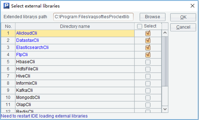 Click Browse button to choose the directory holding the external library folder. By default, the folder is placed under installation directory\esProc\extlib. An external library folder should contain the related Raqsoft core jar and the third-party jar files for enabling the current external library. In the above window, select the external library you want to connect and click OK. You need to restart the IDE to make the setting take effect.