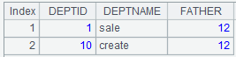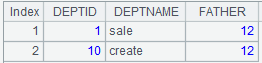 <xml> <row> <DEPTID>1</DEPTID> <DEPTNAME>sale</DEPTNAME> <FATHER>12</FATHER> </row> <row> <DEPTID>10</DEPTID> <DEPTNAME>create</DEPTNAME> <FATHER>12</FATHER> </row> </xml> |
