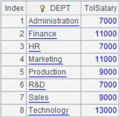 =A3.group(DEPT;sum(SALARY):TolSalary) |
