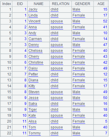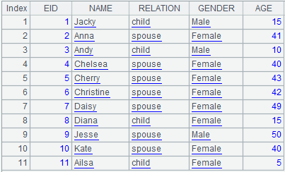 =demo.query("select * from FAMILY").sort(EID) |