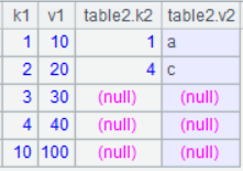Retrieve columns k1 and v1 from the composite table’s base table, and columns k2 and v2 from attached table table2; record values of k2 and v2 as empty if a record doesn’t have the two fields. Get the first record if there are multiple records in the attached table that correspond to one value.
