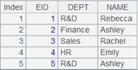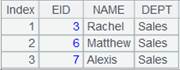 =demo.cursor("SELECT top 5 EID,DEPT,NAME FROM EMPLOYEE") |