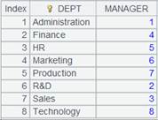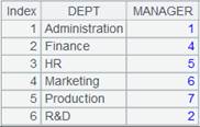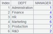 =demo.query("SELECT top 6 DEPT,MANAGER FROM DEPARTMENT") |