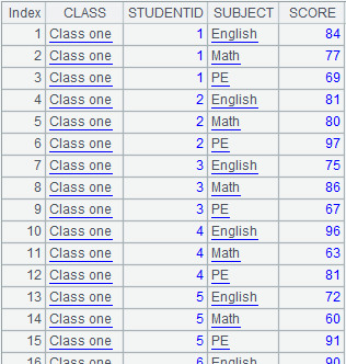 =demo.query("select top 9 class,studentid,subject,score from scores") |