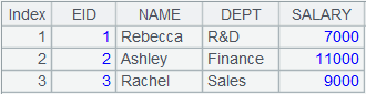 =connect("demo").cursor("select top 10 EID,NAME,DEPT,SALARY from employee") |