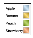 "Legend" means the chart element to be plotted is a legend. "legendText":A1 means the legend’s text content is Apple,Banana,Peach,Strawberry; "x":0.81 / "y":0.2 is the starting coordinate position in x/y axis on the canvas; when the value is greater than 0 and less than and equivalent to 1, it means the percentage of the coordinate in the canvas’s width/length. "width":90 means the width of legend area is 90 pixel. |