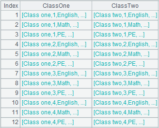 Join table sequences A1 and A2 according to record positions and return a pure table sequence consisting of ClassOne field and ClassTwo field.