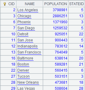 =connect("demo").query("SELECT * FROM STATECAPITAL where STATEID<30").keys(STATEID) |