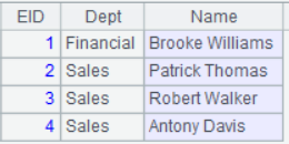 =connect("demo").query("select EID,NAME,GENDER,SALARY from employee").sort(EID ) |
