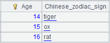 =create(Age,Chinese_zodiac_sign).record([14,"tiger",15,"ox",16,"rat"]).keys(Age) |