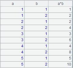 =A1.news(2; A1.~:a, ~:b,a*b) |