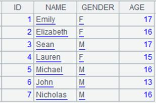 =connect("demo").query("SELECT ID,NAME,GENDER,AGE FROM STUDENTS") |