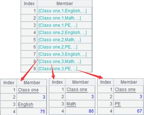 Perform row-to-column transposition on A1’s members: group A1 by the 1st member of its member sequences, put the 2nd and the 3rd members of the member sequences to corresponding sequences in each group, and return the following result: