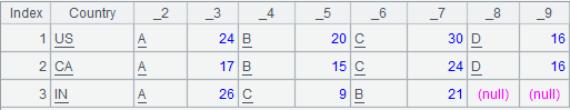 @r option enables column-to-row transposition: group A1 by Country, put values of Label1, Total1, Label2, Total2, Label3, Total3, Label4 and Total4 fields in each group under corresponding new columns Label and Total in order and return the following result: