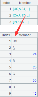 @r option enables column-to-row transposition on A2: put every two members from the 2nd to the last in order in each member sequence of A2 in one group, combine each group with the 1st member of A2’s member sequences to form a new member sequence, and return a result same as A1. |