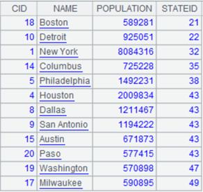 =connect("demo").query("SELECT top 20 CID,NAME,POPULATION,STATEID FROM CITIES").sort(STATEID) |