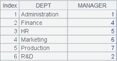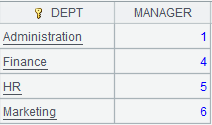=demo.query("SELECT top 6 DEPT,MANAGER FROM DEPARTMENT") |