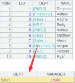 Table sequence A2’s foreign key DEPT has a correspondence relationship with table sequence A1’s DEPT field. Replace the foreign key value with the referenced records in A1, and enter null if no matching A1 record can be found.
