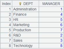 Return a table sequence using DEPT as the key: