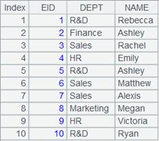 =demo.query("select top 10 EID,NAME,DEPT,GENDER from EMPLOYEE") |