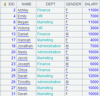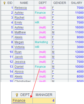 Execute expression in A4 to define a computation on A2’s pseudo table, which will convert its DEPT field values into corresponding referencing field values in table sequence A3, and retrun a new pseudo table. Execute expression in B4: import data from A4’s pseudo table while executing the computation deinfed in A4 on A2’s pseudo table, and return the following table: