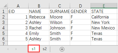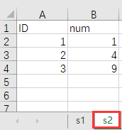Enter string aa to cell A3 in sheet s2, string bb to cell A4 in the next row, and string cc to cell B4 in the next column to the right. |