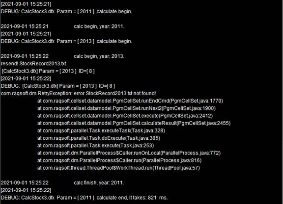 In the above cellset file, fork statement is used to compute data of specified stocks in all years. In the code block, line 4 checks whether the necessary file exists and uses end statement to return abnormal termination information and enable a reassignment of the task if the file cannot be found on the current node. Line 8 uses reduce statement to concatenate result records returned by all nodes. Similar to the example in the previous section where the end statement is added to reduce script, a task that cannot be computed by a node will be redistributed during execution. Here is output information of two nodes: