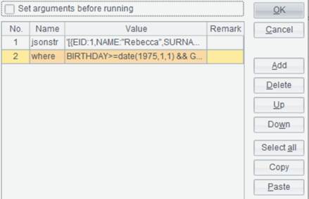 To select female employees born after January 1, 1975 inclusive, esProc script inputs two parameters – “jsonstr” and “where” – from the external program, as shown below: