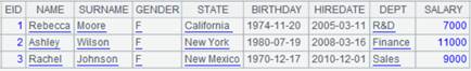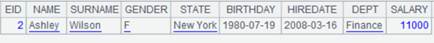 [{"EID":2,"NAME":"Ashley","SURNAME":"Wilson","GENDER":"F","STATE":"New York","BIRTHDAY":"1980-07-19","HIREDATE":"2008-03-16","DEPT":"Finance","SALARY":11000}…] |