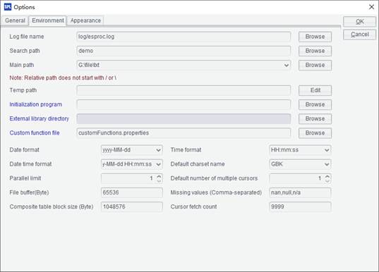 Click Tool>Options on the menu bar to configure the main path and the search path on the Environment page, as shown below: